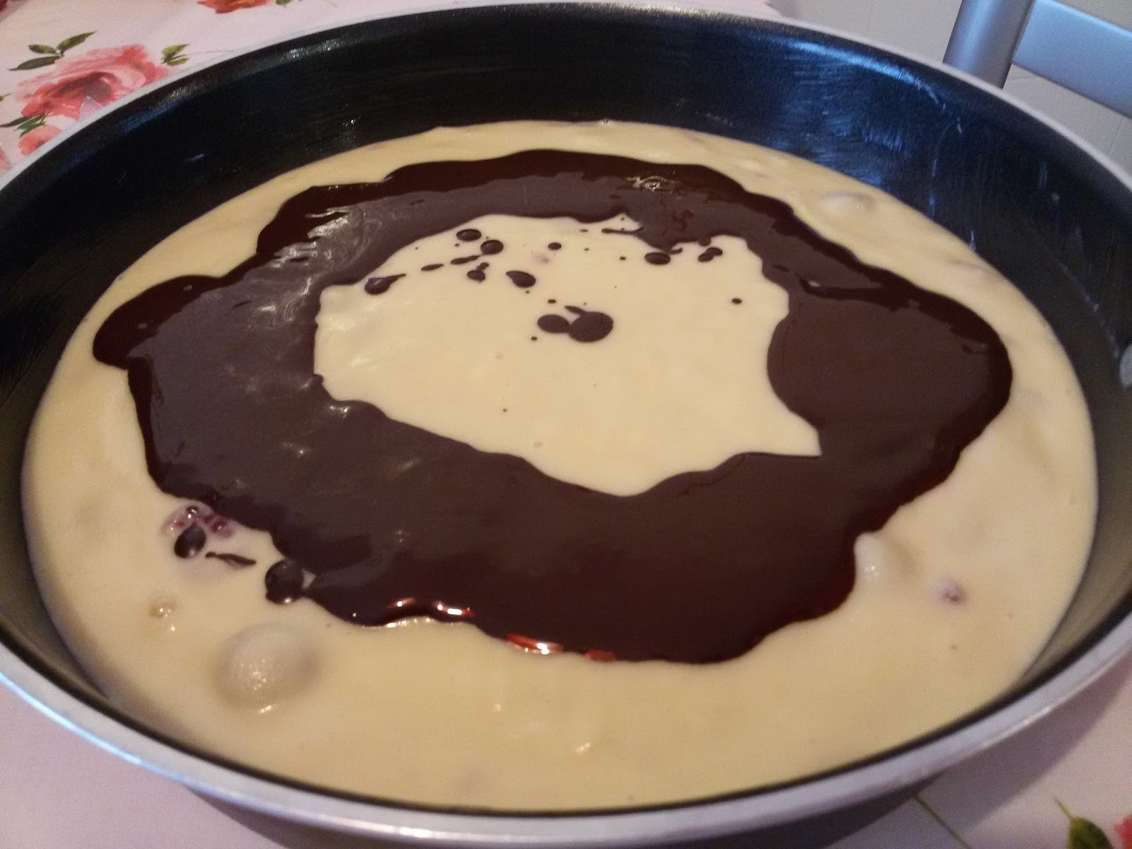 Imburrate una teglia circolare e versate l’impasto, aggiungete poi il cioccolato fuso ed infornate a 180°C per 35/40 minuti.