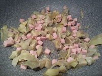In una padella antiaderente versate l’olio ed aggiungete i carciofi surgelati fino ad ammorbidirli per poi tagliarli a pezzettini ed aggiungere il prosciutto cotto a cubetti.