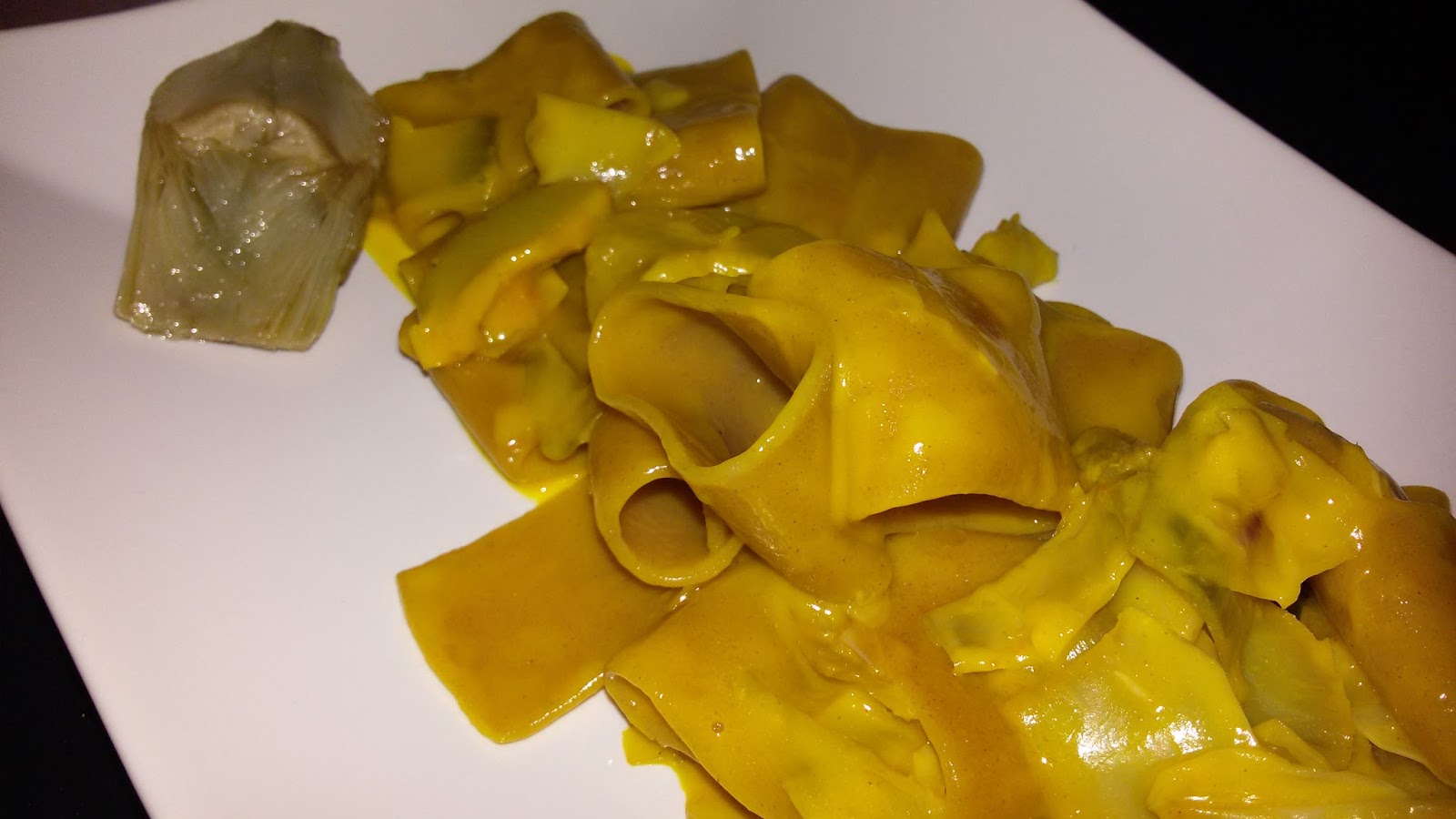 Mezzi paccheri di teff con carciofi, crema di zafferano e pecorino